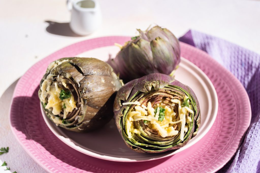Lavar los alcauciles y cortar el tallo. Sacar las hojas de la base, cortar las hojas de la parte superior y ahuecar el medio.