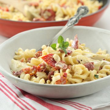 Ensalada de pasta con tomates secos y pesto de rúcula